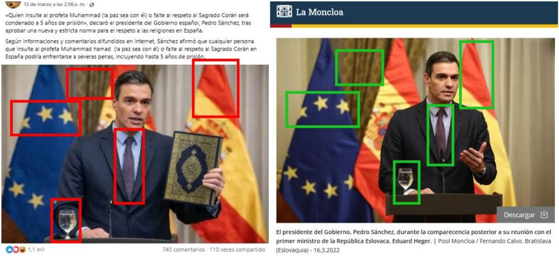 Eine Stichwortsuche auf Englisch nach "Pedro Sánchez Slovakia March 2022" führte zu einer Pressemitteilung der spanischen Regierung sowie zu Fotos, die dem online geteilten Bild ähneln. Von Sánchez während seiner Reise nach Bratislava wurde auch ein Video veröffentlicht. Allerdings hält er an keiner Stelle ein Exemplar des Korans. Ähnliche Elemente sind im folgenden Vergleich zu sehen: