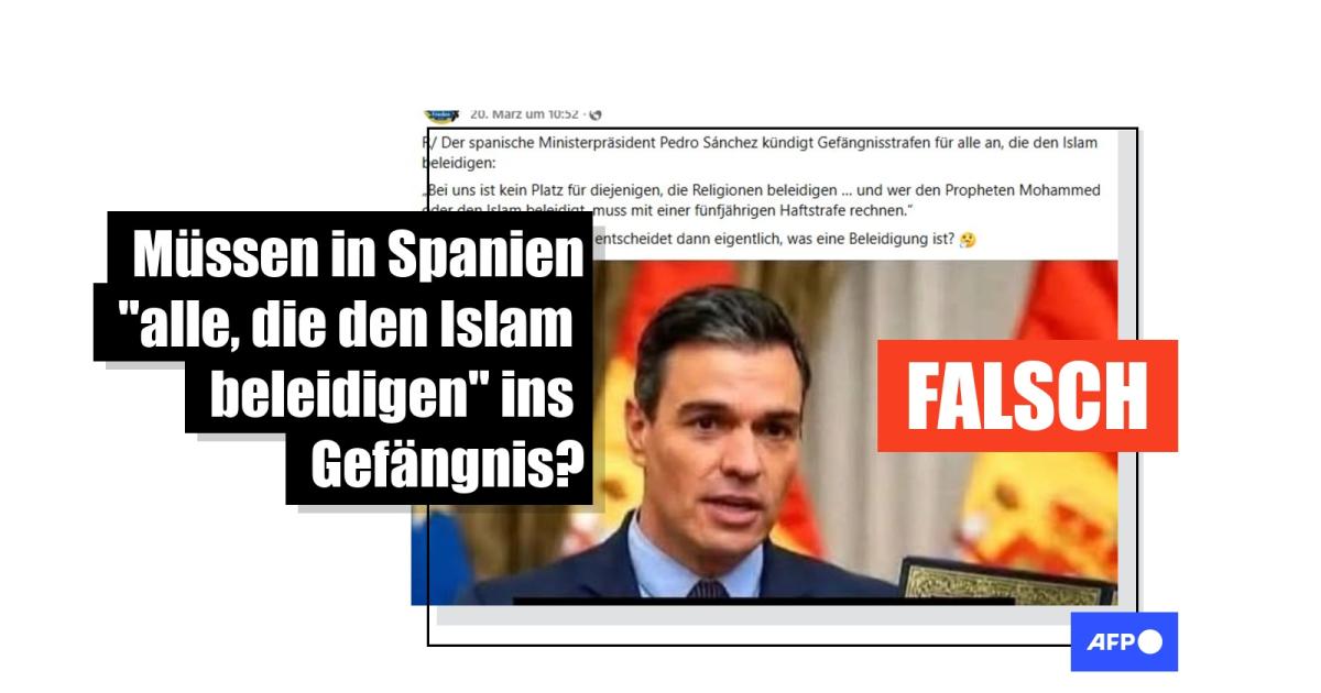 Das Verspotten von Religionen gilt in Spanien nach dem Strafgesetzbuch als Straftat. Behauptungen in sozialen Medien, wonach der spanische Ministerpräsident Pedro Sánchez angekündigt hätte, dass die Beleidigung des Islam mit fünf Jahren Gefängnis bestraft werde sind ebenso falsch wie ein dazu kursierendes Bild. Das entsprechende Gesetz sieht Geldstrafen, nicht Gefängnisstrafen vor, und wurde seit 1995 nicht geändert.
