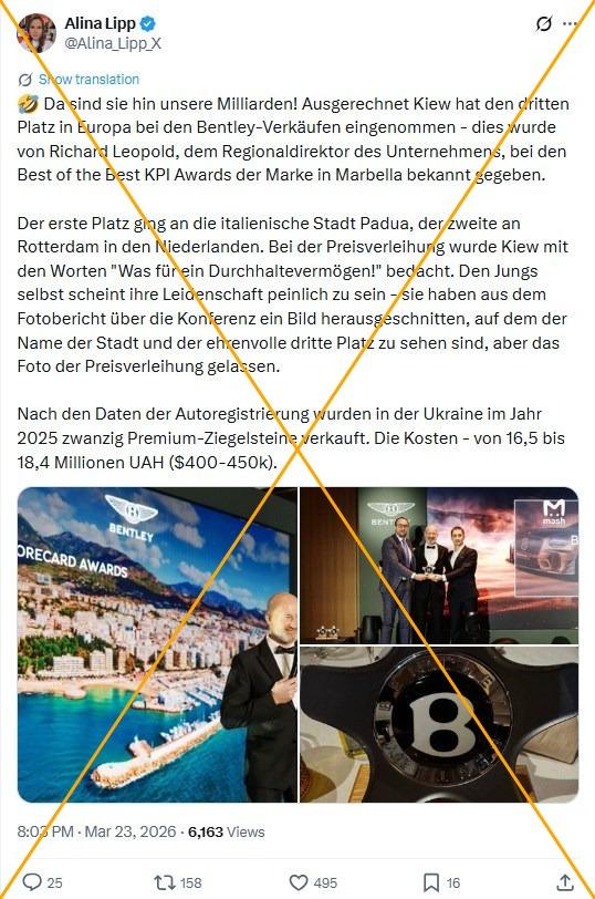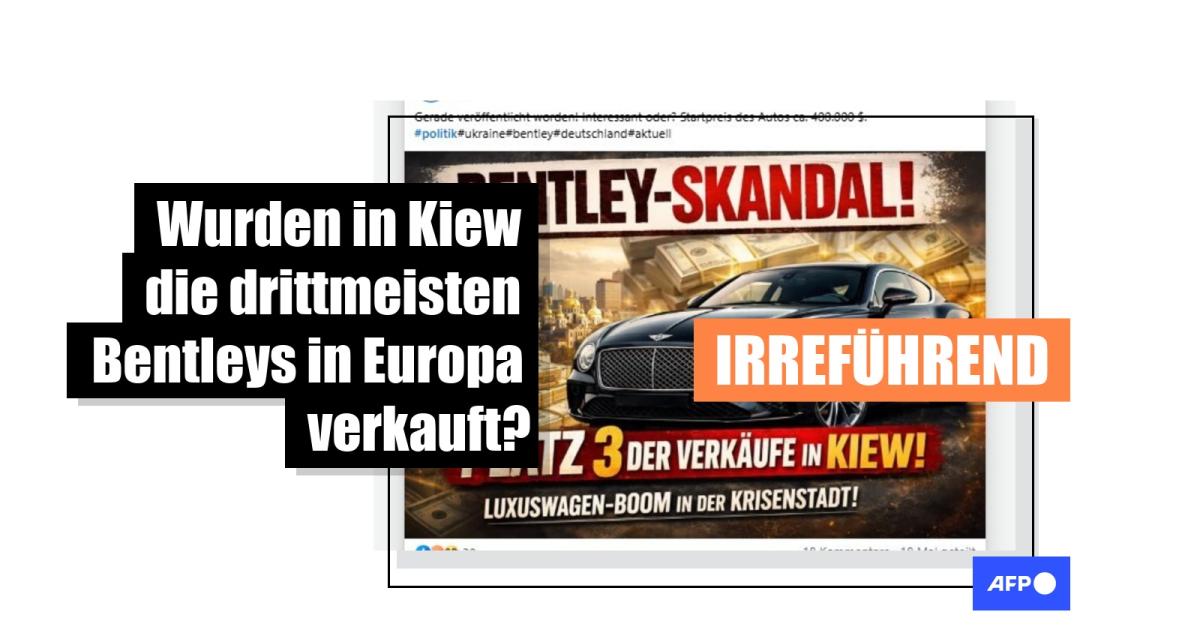 Seit dem Beginn des russischen Angriffskriegs im Jahr 2022 verbreiten kremlfreundliche Social-Media-Accounts regelmäßig falsche oder irreführende Behauptungen über die Ukraine. Im März 2026 kursierten Postings, in denen behauptet wird, dass im Europavergleich in Kiew am dritthäufigsten Autos der Marke Bentley verkauft wurden. Als Beweis dafür verweisen die Postings darauf, dass die Bentley-Filiale in Kiew den dritten Preis bei den jährlichen Händlerauszeichnungen gewonnen habe. Der Autohersteller erklärte jedoch, dass die Verkaufsdaten absichtlich falsch interpretiert und dargestellt wurden. Bentley habe im Jahr 2025 in der Ukraine im Vergleich zu anderen Ländern nur sehr wenige Autos verkauft.