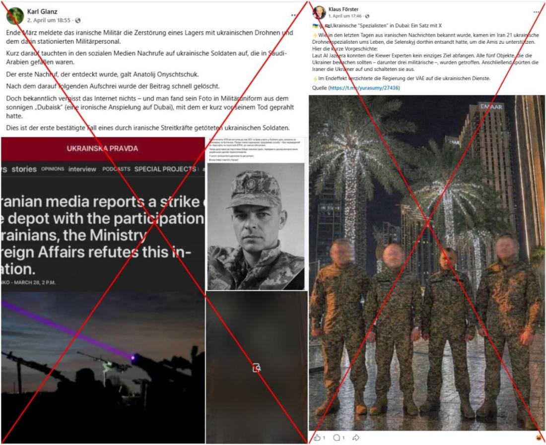 "Dies ist der erste bestätigte Fall eines durch iranische Streitkräfte getöteten ukrainischen Soldaten", lautet die Facebook-Beschreibung zu einem schwarzweißen Bild eines Mannes in Militäruniform am 2. April 2026. Ein angeblicher Nachruf aus den Vereinigten Arabischen Emiraten (VAE) ist auf den Namen Anatoli Onischtschuk ausgestellt, dieser soll auch auf den geteilten Fotos zu sehen sein. In einem anderen Facebook-Beitrag vom 1. April 2026 wurde ein weiteres Bild geteilt, das vier Soldaten zeigt, darunter auch Onischtschuk, wie es heißt. Laut der Behauptung seien "21 ukrainische Drohnenspezialisten ums Leben" gekommen, "die Selenskyj dorthin entsandt hatte, um die Amis zu unterstützen".