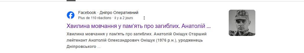 Eine umgekehrte Bildsuche über Google führte zu einer Veröffentlichung von "Dnipro Preratyvnyi", die inzwischen nicht mehr verfügbar ist. Die Vorschau des Suchergebnisses zeigt jedoch, dass diese Seite tatsächlich einen Beitrag mit dem Porträt, auf dem das Gesicht des oben erwähnten "Helden Mikola Syschchyk" verjüngt war, veröffentlicht hatte. In der Vorschau ist ein Textauszug zu lesen, der lautet: "Eine Schweigeminute für die Vermissten. Leutnant Anatoli Oleksandrowytsch Onischtschuk (geboren 1976), aus Dnipro".