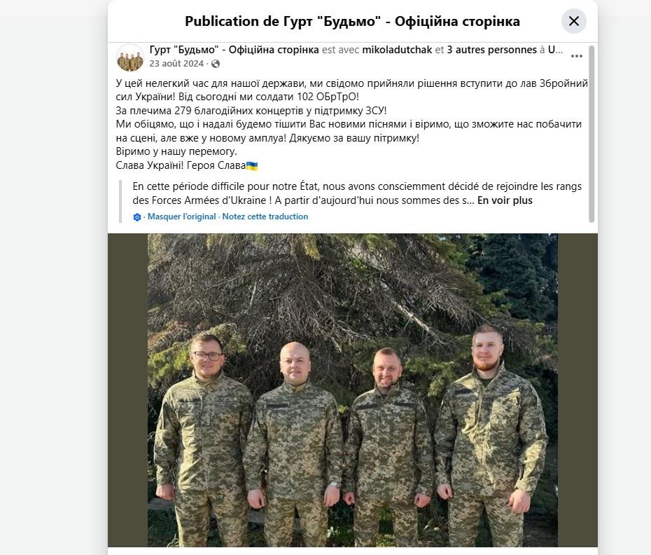 Das Originalfoto stammt aus einem Facebook-Beitrag der ukrainischen Band Budmo vom August 2024, in dem angekündigt wurde, dass ihre Mitglieder sich der ukrainischen Armee angeschlossen hätten.