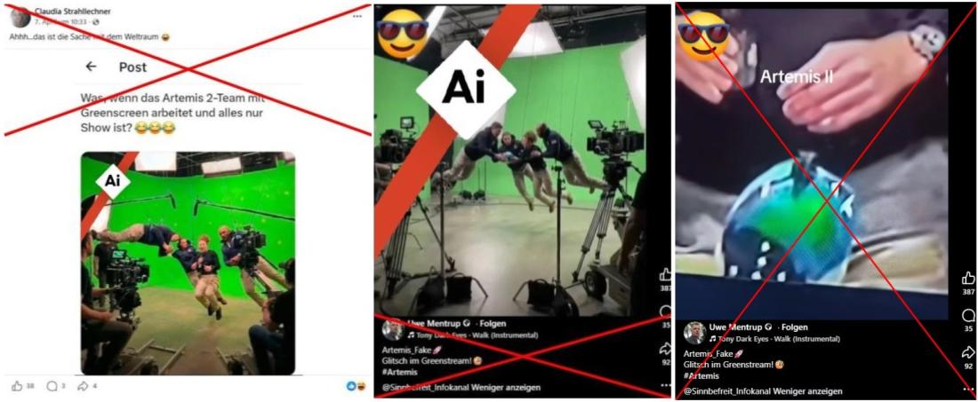 Artemis 2 ist die erste bemannte Mondmission seit mehr als 50 Jahren. Doch online wird fälschlich behauptet, offizielle Bilder oder Videos der Artemis‑2‑Mission seien nicht im Weltraum entstanden, sondern vor einem Greenscreen aufgenommen worden. Dazu kursierten zwei KI-manipulierte Bilder der vierköpfigen Crew, die in einem Studio an Sicherungen zu hängen scheint. Als angeblicher Beweis wird auch ein Video geteilt, in dem eingeblendeter Text durch das offizielle Plüsch-Maskottchen der Reise hindurchscheint. Doch dabei handelt es sich laut einem Experten um eine fehlgeschlagene Textüberlagerung. Auf offiziellen Aufnahmen blieb das Plüschtier unverändert.