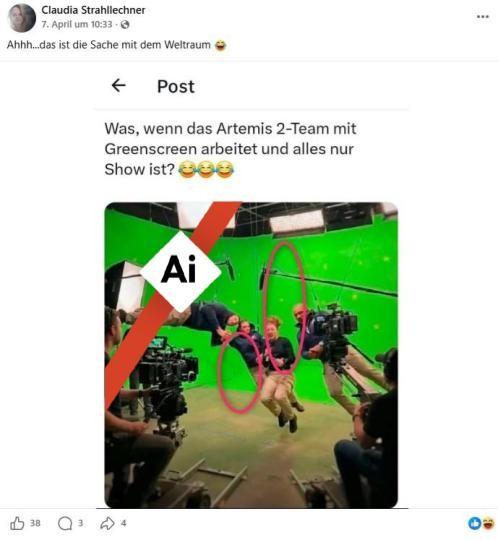 Die Originalaufnahmen der Astronautin und der Astronauten stammen vom 3. April 2026 und wurden von der Nasa selbst veröffentlicht. Aus einem Standbild ab Minute 17 scheint die Besatzung ausgeschnitten und in ein angebliches Studio eingefügt worden zu sein.