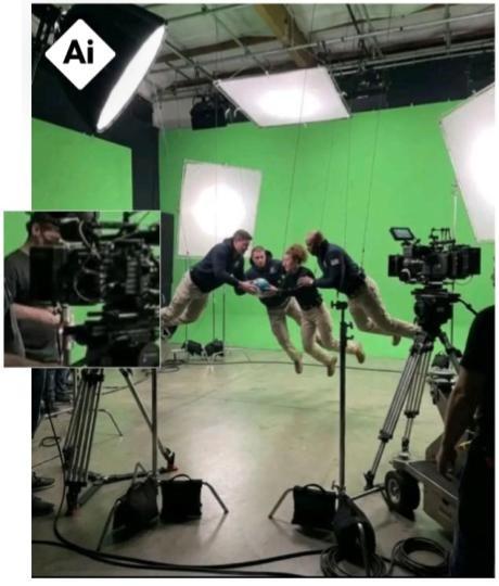 Das zweite vom angeblichen Filmset kursierende Bild ist ebenfalls höchstwahrscheinlich mit KI erstellt worden. Das angebliche Beweismaterial soll dieselbe Szene vom Besatzungsteam im All nachstellen. Dabei unterscheidet es sich vom eben untersuchten Bild durch Elemente wie Kameraausrüstung sowie Scheinwerfer. Als Hinweis für eine KI-Erstellung fällt auf, dass der Arm des Kameramannes auf der linken Seite verschwommen ist und die Hand zu fehlen scheint.