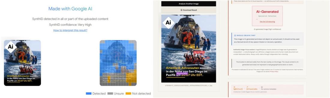 AFP analysierte das Bild mit dem SynthID-Erkennungstool von Google, das zu dem Ergebnis kam, dass das Bild höchstwahrscheinlich mit der KI von Google erstellt wurde. Auch das inzwischen teilweise kostenpflichtige Tool ImageWhisperer, das Verifikationsexperte Henk van Ess erstellte und derzeit weiterentwickelt, erkannte mit hoher Sicherheit Spuren einer KI-Erstellung.