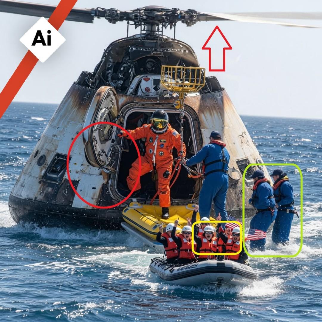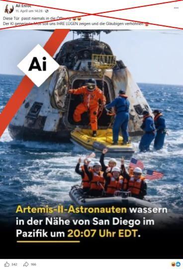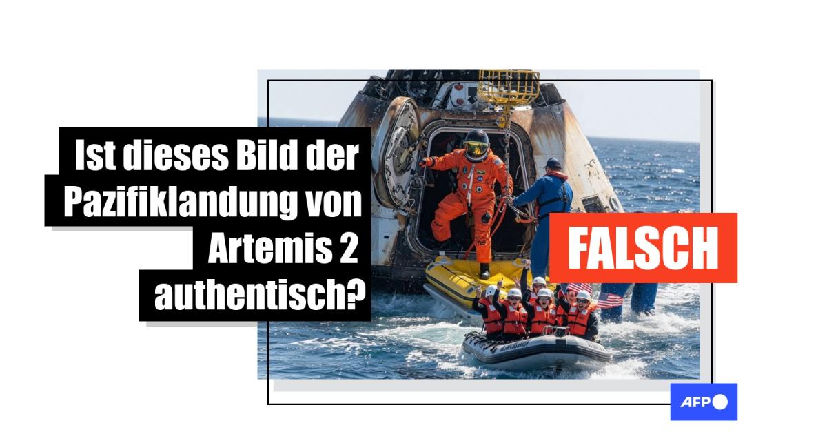 Nach rund zehn Tagen im All und einer historischen Umrundung des Mondes ist die Besatzung der Artemis‑2‑Mission am 10. April 2026 im Pazifischen Ozean gelandet. In sozialen Medien verbreitete sich anschließend ein angebliches Bild der Raumkapsel Orion, das Nutzerinnen und Nutzer als Hinweis auf eine Inszenierung der Mission werteten. Sie verwiesen dabei auf Merkmale, die auf eine Erstellung mithilfe Künstlicher Intelligenz hindeuten würden. Das kursierende Bild wurde tatsächlich mit KI erzeugt, wie Verifikationstools zeigen, stammt jedoch nicht von der US‑Raumfahrtbehörde Nasa. Offizielle Aufnahmen zeigen zudem, dass die Mission stattgefunden hat.