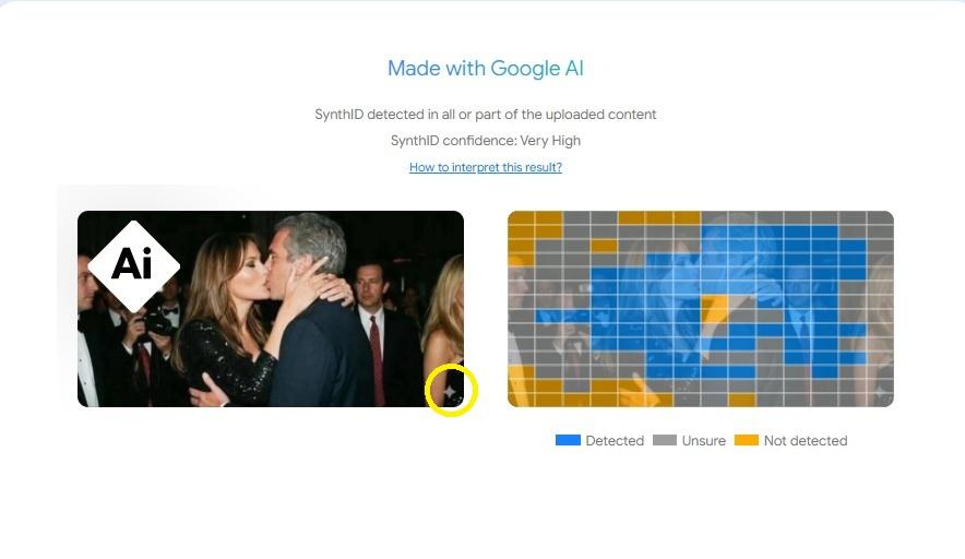 Auch laut einer Analyse von Googles SynthID, einem Tool zur Erkennung von KI-generierten Inhalten, wurde das Bild höchstwahrscheinlich mithilfe von Google KI erstellt.