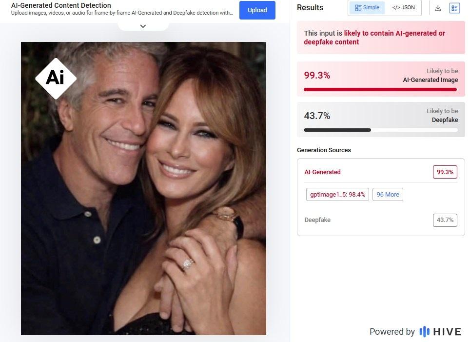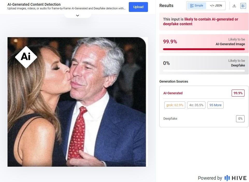 Das Bild 4 soll angeblich Epstein und Melania Trump zeigen, wie sie sich umarmen und lächelnd in die Kamera blicken. Auf X wurde am 14. Februar 2026 eine größere Version des Bildes gepostet. Bei genauerer Betrachtung fällt auf, dass im Vergleich zu authentischen Aufnahmen Epsteins Zähne anders aussehen. Auch Hive Moderation gab mit einer Wahrscheinlichkeit von 99,3 Prozent an, dass es sich um ein von KI-generiertes Bild handelt. Laut Hive Moderation wurde es mit einer Wahrscheinlichkeit von 98,4 Prozent mithilfe von ChatGPT erstellt.