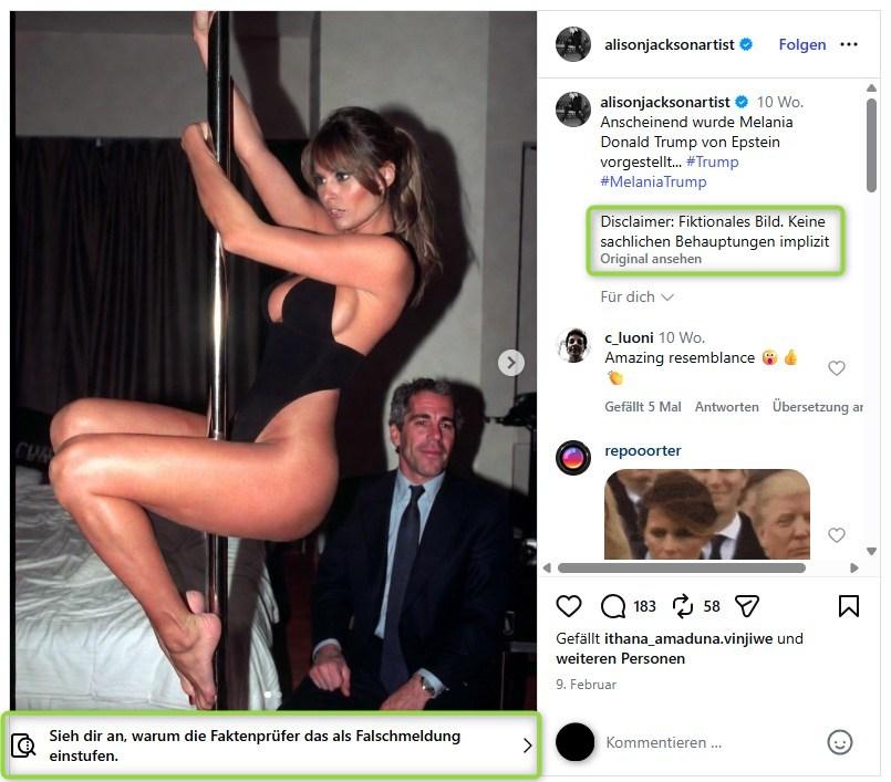 Mithilfe von Googles Faktencheck-Tool lässt sich dieses Bild auf das Instagram-Profil der britischen Künstlerin Alison Jackson zurückführen. Am 9. Februar 2026 veröffentlichte die Künstlerin das Bild mit der Beschreibung: "Fiktionales Bild. Keine sachlichen Behauptungen implizit". Unabhängige Journalistinnen und Journalisten stuften das Bild in dem Instagram-Beitrag als falsch ein.