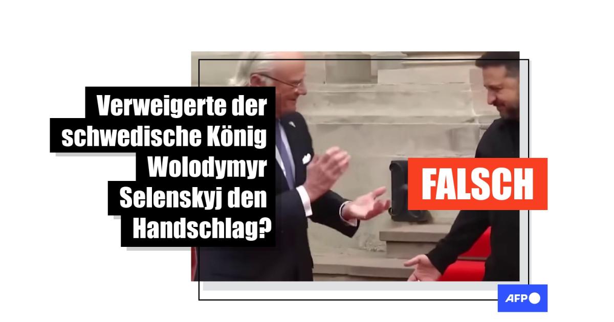 Das schwedische Königshaus dementierte die Falschbehauptung, wonach der schwedische König Selenskyj nicht mit einem Händedruck gewürdigt habe, gegenüber dem schwedischen öffentlich-rechtlichen Fernsehsender SVT am 18. April 2026. Im Bericht wird ein X-Beitrag des russischen Staatssenders Russia Today (RT) erwähnt. AFP konnte das konkrete Video nicht ausfindig machen, da RT in der EU gesperrt ist – dessen Logo ist jedoch in den geteilten Videos zu sehen. Es sei "falsch und hässlich", dass Russland das Treffen so beschreibe. Selenskyj und der König hätten sich im Zusammenhang mit der Sequenz im Clip mehrfach die Hand geschüttelt, zitierte SVT eine Sprecherin des Königshauses. Dieses veröffentlichte zuvor ein Bild, auf dem der Monarch und der Präsident händeschüttelnd in die Kamera lächeln.