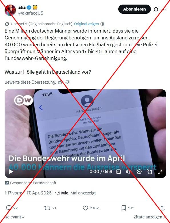 Ein weiterer X-User wiederholte am 17. April 2026 auf Englisch die Behauptungen: "40.000 wurden bereits an deutschen Flughäfen gestoppt. Die Polizei überprüft nun Männer im Alter von 17 bis 45 Jahren auf eine Bundeswehr-Genehmigung. Was zur Hölle geht in Deutschland vor?" Der vielfach gelikte Beitrag ist mit dem Hinweis versehen, dass es sich hier um eine "Gesponserte Partnerschaft" handelt, was bedeutet, dass dieser Nutzer potenziell für die Veröffentlichung des Inhalts bezahlt wurde.