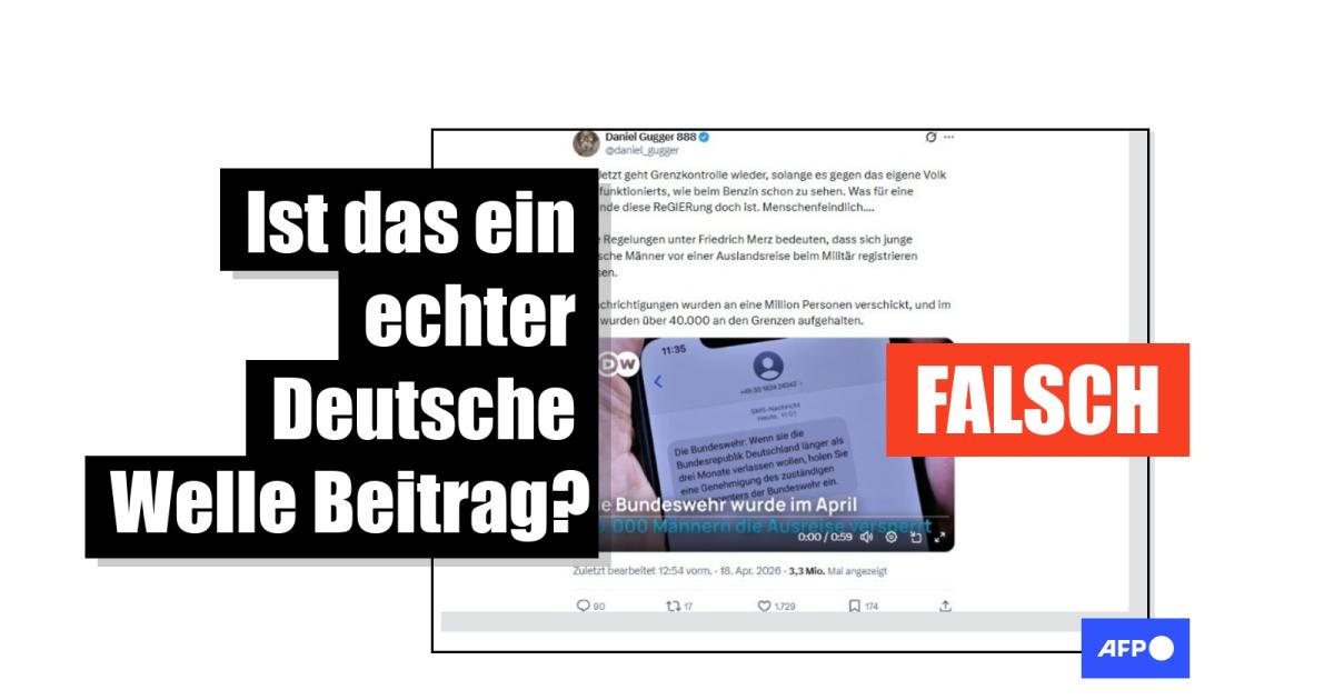 In sozialen Medien kursierte ein Video, das an einen Bericht des Mediums Deutsche Welle erinnert. Im Video wird unter anderem fälschlich behauptet, dass in Deutschland im April 2026 mehr als 40.000 Männern die Ausreise an Flughäfen verweigert wurde. Das Video weist jedoch Fehler auf, die auf eine Fälschung hindeuten. Die Deutsche Welle bestätigte AFP, dass es sich tatsächlich um eine Nachahmung handelt und das Logo missbräuchlich genutzt wurde. Das deutsche Verteidigungsministerium dementierte zudem die im Video vorkommenden Behauptungen.