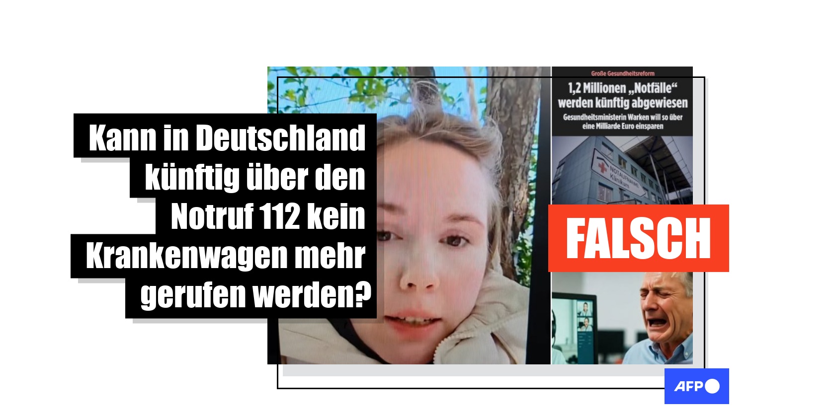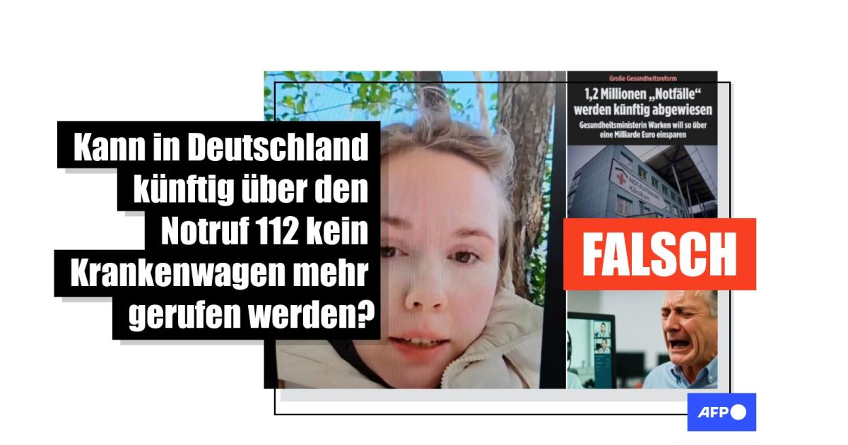 Bei Lebensgefahr ist die Notrufnummer 112 zu wählen. Doch online verbreitete sich die Falschbehauptung, dass eine direkte Hilfe nicht mehr möglich sein würde. "Sie wollen die Deutschen echt umbringen", lautete ein X-Beitrag am 24. April 2026, der fast 113.000 Mal angesehen wurde. "Nach Umsetzung der neuen Gesundheitsreform wird es nicht mehr möglich sein, direkt einen Krankenwagen zu rufen", warnte Alina Lipp. Die prorussische Bloggerin wurde von der Europäischen Union wegen "destabilisierenden Aktivitäten gegen die EU" sanktioniert und fiel AFP bereits mit der Verbreitung von unzutreffenden Behauptungen auf. Sie fügte in einem ihrer neuesten Telegram-Beiträge hinzu, dass Deutschland "der Ukraine halt zu viel geschenkt" habe und nun bei den Staatsangehörigen sparen müsse.