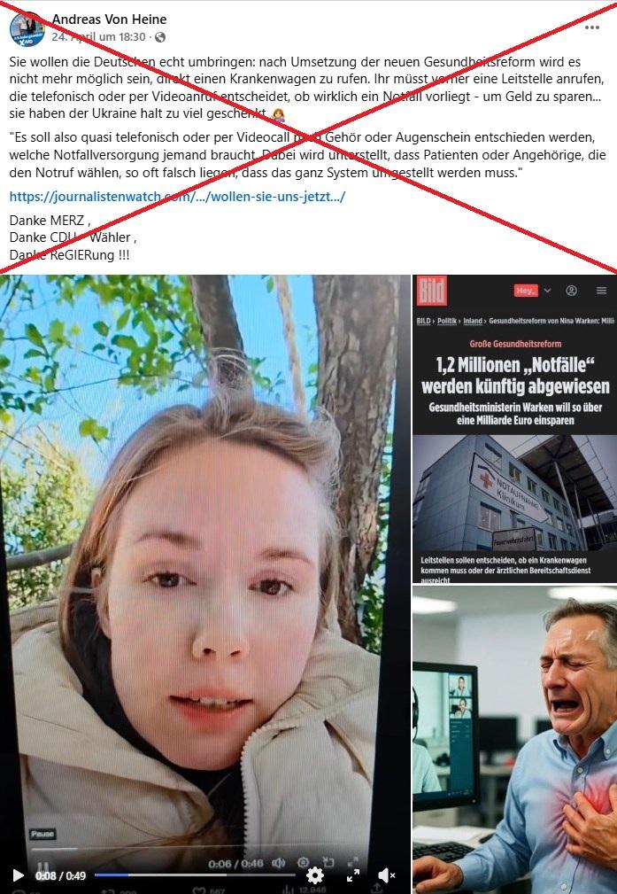 Beide Profile teilten einen Blogbeitrag von "Journalistenwatch", dessen Falschbehauptungen AFP bereits richtigstellte. Die Plattform schrieb am 23. April 2026: "Patienten sollen nicht mehr direkt den Notruf wählen dürfen – bei Schlaganfall oder Herzinfarkt erst mal Videocall". Weiter heißt es, ein neues Gesetz würde vorsehen, dass Patientinnen und Patienten erst telemedizinisch über die Nummer 116117 oder per Videocall behandelt werden würden, um "Notaufnahmen und Rettungsdienste zu entlasten".