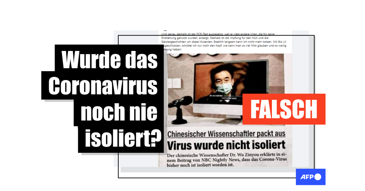 Geteilt wird das Foto eines nicht näher verorteten Zeitungsartikels aus dem Frühjahr 2021 mit der Überschrift: "Chinesischer Wissenschaftler packt aus. Virus nicht isoliert." Der Text beschreibt ein Interview mit dem Wissenschaftler Wu Zinyou von der chinesischen Gesundheitsbehörde in der US-amerikanischen Nachrichtensendung NBC Nightly News. Der Forscher habe darin zugegeben, dass das alleinige Virusgenom nie vorgelegen habe. Weiter heißt es: “Die angeblich geglückte Isolation des Virus, die in zahlreichen Veröffentlichungen behauptet wird, beruht offenbar auf einer Vermischung von Probenmaterial mit anderen Zellen. Die Proben seien somit "kontaminiert", heißt es.
