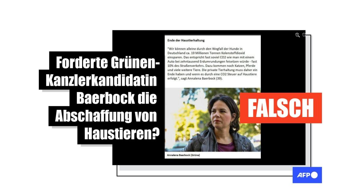 Nach dieser Logik ginge nur eins von beidem: Haustiere oder Klimaschutz. Tausende User auf Facebook glauben Ende April, dies sei die Ansicht der neuen Kanzlerkandidatin der Grünen, Annalena Baerbock. Sie teilen ein Bild der Politikerin (hier, hier, hier), auf dem das folgende vermeintliche Zitat von ihr inklusive Rechtschreibfehlern zu lesen ist: