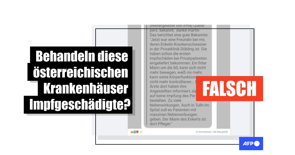 Seit 7. Januar haben mehr als 200 Nutzerinnen und Nutzer einen Facebook-Beitrag geteilt, wonach in der Wiener Privatklinik Döbling erste Patienten mit Impfschäden eingeliefert worden seien. Die Information stamme von einer "persönlich bekannten Quelle", heißt es im Posting. "Jetzt war eine Freundin bei mir, deren Enkelin Krankenschwester in der Privatklinik Döbling ist", heißt es zur Quelle. Unter den Patientinnen und Patienten befinde sich auch ein zuvor fitter Mann um die 60 Jahre alt. Im niederösterreichischen Krankenhaus Tulln sei es ähnlich, dort soll es "Patienten mit massiven Nebenwirkungen geben", heißt es im selben Posting. Die Quelle hierfür: Der Mann des Enkels sei dort Pfleger.