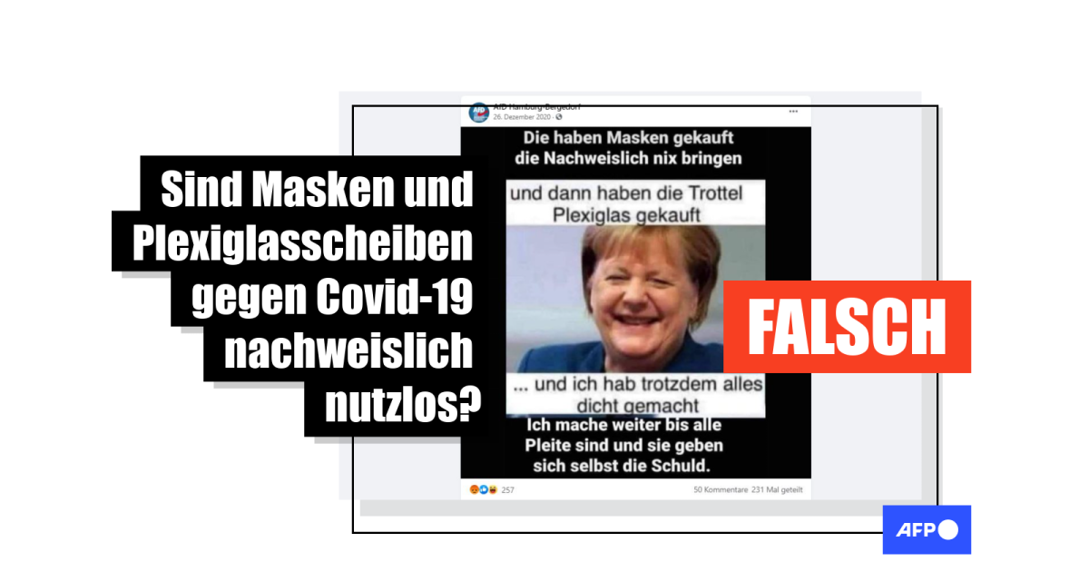 Auch Plexiglasscheiben stellt das Facebook-Posting infrage. Diese sind aber als Teil mehrerer Vorsichtsmaßnahmen durchaus sinnvoll. Das erklärt zum Beispiel der Professor für Maschinenbau Qingyan Chen von der Purdue Universität in Indiana. Einer seiner Forschungsschwerpunkte liegt in der Luftverteilung in Gebäuden. In seinem Papier von August 2020 über die Möglichkeiten, sich vor Covid-19 zu schützen, rät er: "Natürlich gibt es Innenräume, in denen man keine Maske tragen kann, wie in Restaurants und Bars. Hier wäre es wichtig (...) Plexiglasscheiben in der Mitte eines Tisches oder zwischen den Gästen zu installieren. (...) Der Schirm hilft sehr dabei, die mögliche Ansteckung durch die Tröpfchenwolke zu reduzieren, die von der Person auf der anderen Seite des Tisches ausgehustet wird." Die Plexiglasscheibe wirke dabei wie eine Barriere.