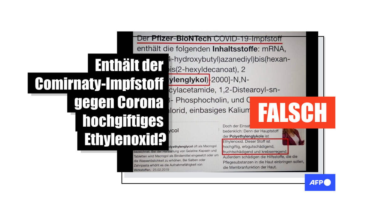 Corona-Impfungen, vor allem die neuen mRNA-Impfstoffe der Hersteller Biontech/Pfizer und Moderna, werden immer wieder Ziel von Falschinformations-Kamapgnen. In solchen heißt es etwa, der Impfstoff mache Frauen unfruchtbar, er verändere die DNA im Körper, er sei radioaktiv, oder er verursache unkontrollierbares Zellsterben. Behauptungen wie diese hat AFP in der Vergangenheit widerlegt. Auch das vermeintlich enthalte hochgiftige Ethylenoxid gehört in diese Reihe an Falschbehauptungen.