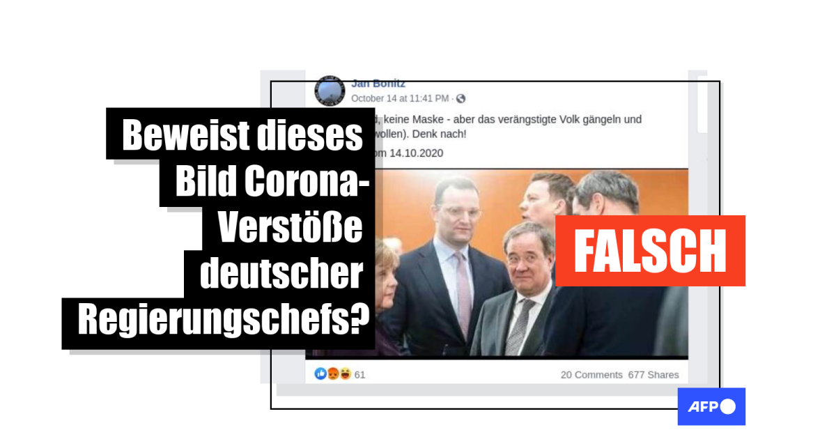 Der größte von AFP gefundene Beitrag datiert auf den 15. Oktober, hat das Bild hier auf Facebook online gestellt (700 Shares). Anschließend haben es die Gruppen "Querdenken 69" mit rund 1.200 Anhängern und "Zensurfrei" mit rund 2.500 Anhängern aufgegriffen (hier, hier). Die Aufnahme zeigt Bundeskanzlerin Angela Merkel, Gesundheitsminister Jens Spahn sowie Nordrhein-Westfalens Ministerpräsident Armin Laschet, Bayerns Markus Söder und Tobias Hans aus dem Saarland. Keiner von ihnen trägt eine Maske oder hält Abstand. In der Beschreibung des Fotos heißt es: "Kein Abstand, keine Maske - aber das verängstigte Volk gängeln und maßregeln (wollen). Denk nach! Aufnahme vom 14.10.2020."