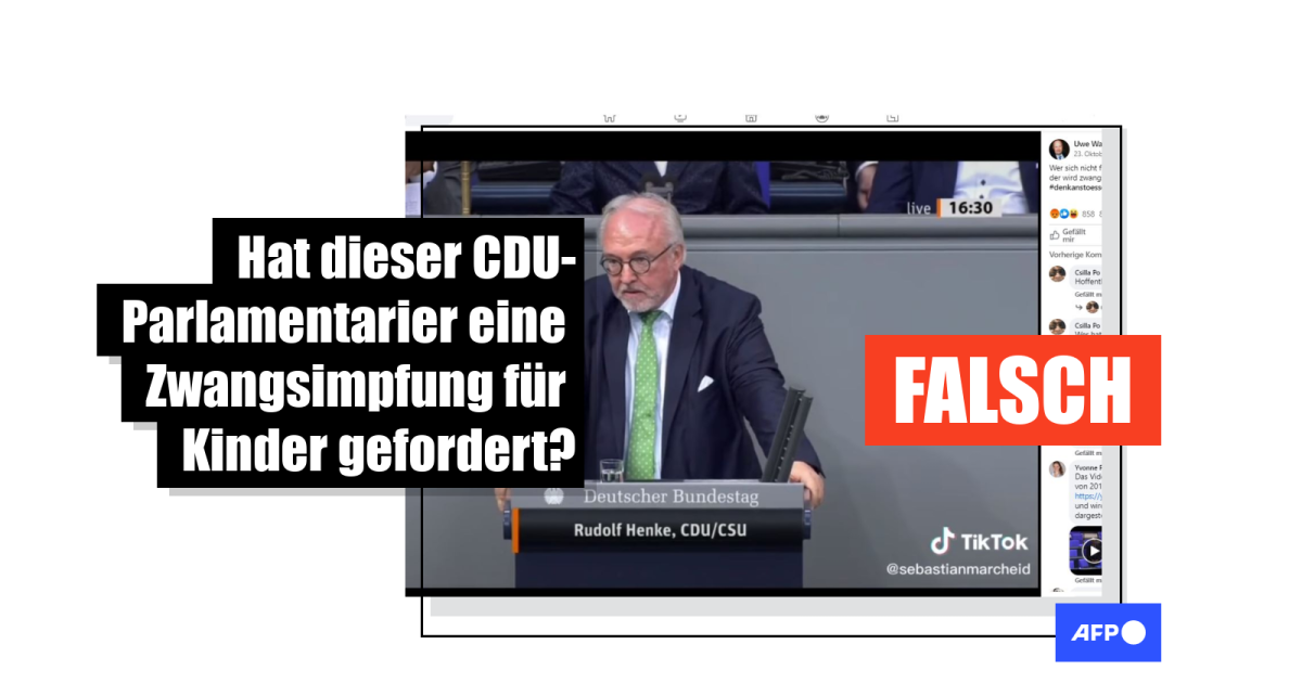Am Pult des Bundestags sagt Rudolf Henke als Redner für die Fraktion CDU/CSU tatsächlich: "Meine Assoziation zur Impfpflicht ist: Ein Kind, dessen Eltern sich weigern, das Kind impfen zu lassen, bekommen Besuch von der Polizei, das Kind wird ihnen entzogen und wird in ein Gesundheitsamt gebracht und dort wird eine Pflichtimpfung durchgeführt." Die geschnittenen Videos zeigen aber nicht, dass er noch mehr sagte.