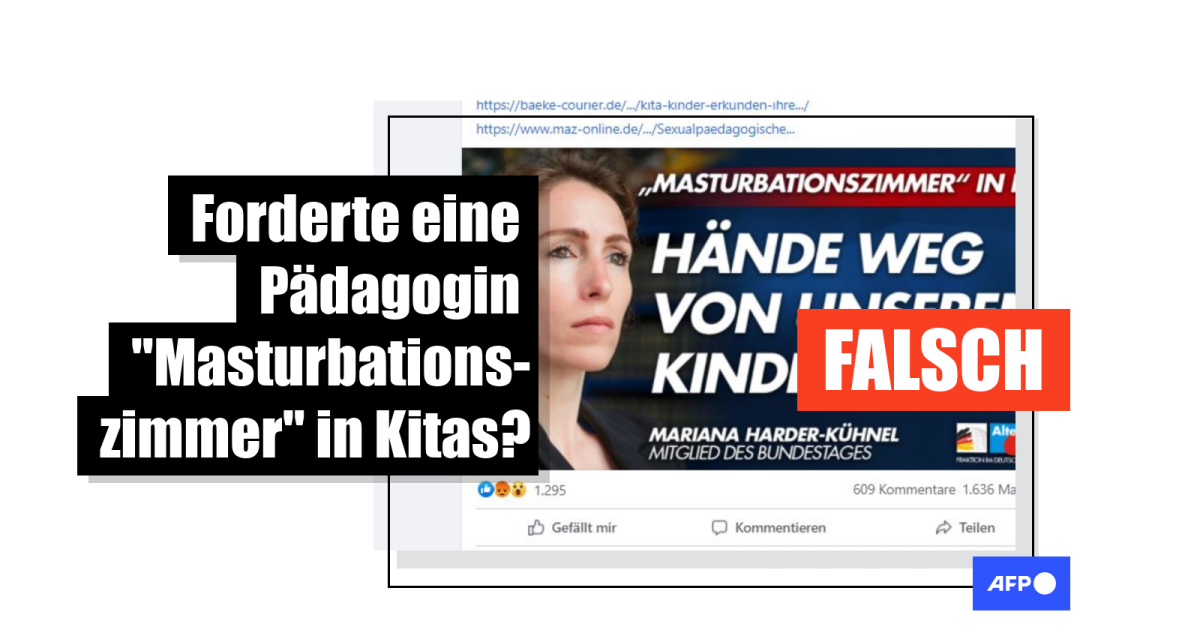 In all diesen Postings ist von einem "Masturbationszimmer" die Rede. Kühnel etwa titelt ihren Facebook-Beitrag mit den Worten: "'Masturbationszimmer' in Kitas: Hände weg von unseren Kindern!" Höchst schreibt: "Sie (die Pädagogin) ist der Meinung, dass Kinder bis sechs Jahre an Masturbation herangeführt werden müssen und Kitas 'Masturbationszimmer' benötigen." Formulierungen wie diese fallen in allen von AFP gesichteten Blog-Einträgen.
