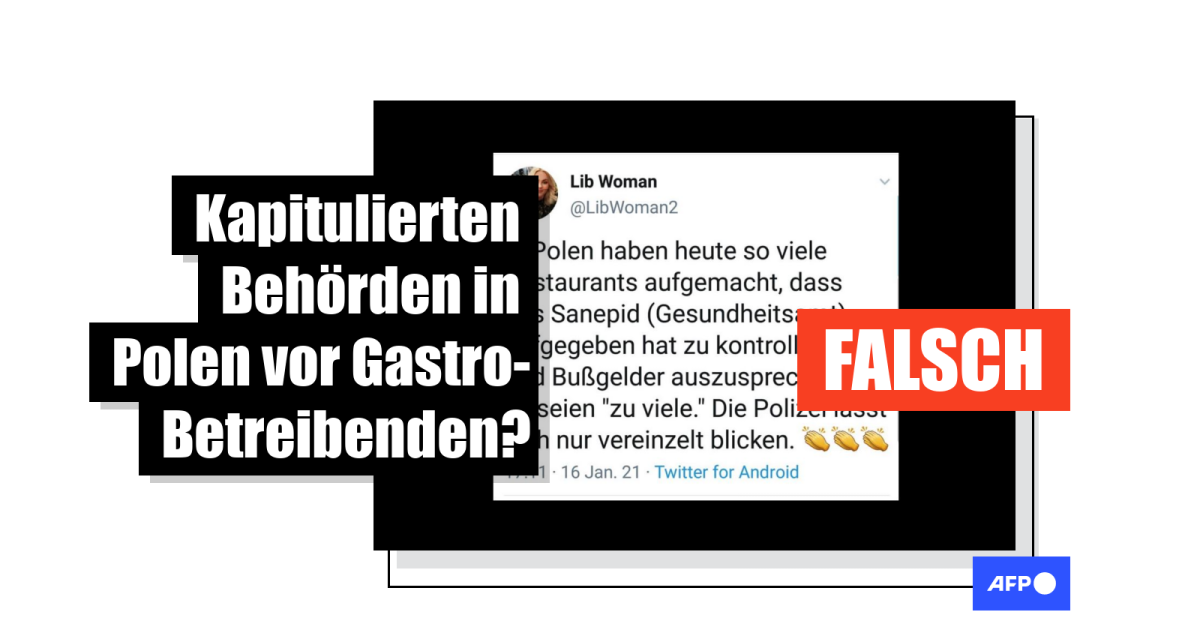 Tausende Facebook-User haben die Behauptung über das "Aufgeben" des polnischen Gesundheitsamts "Sanepid" seit dem 16. Januar geteilt (hier, hier, hier). Weitere Zehntausend sahen sie auf Telegram (hier). Die Postings zeigen den Screenshot eines rund 1600 Mal geteilten Tweets (hier). In diesem heißt es: "In Polen haben heute so viele Restaurants aufgemacht, dass das Sanepid (Gesundheitsamt) aufgegeben hat zu kontrollieren und Bußgelder auszusprechen (...) es seien ‘zu viele.’ Die Polizei lässt sich nur vereinzelt blicken."