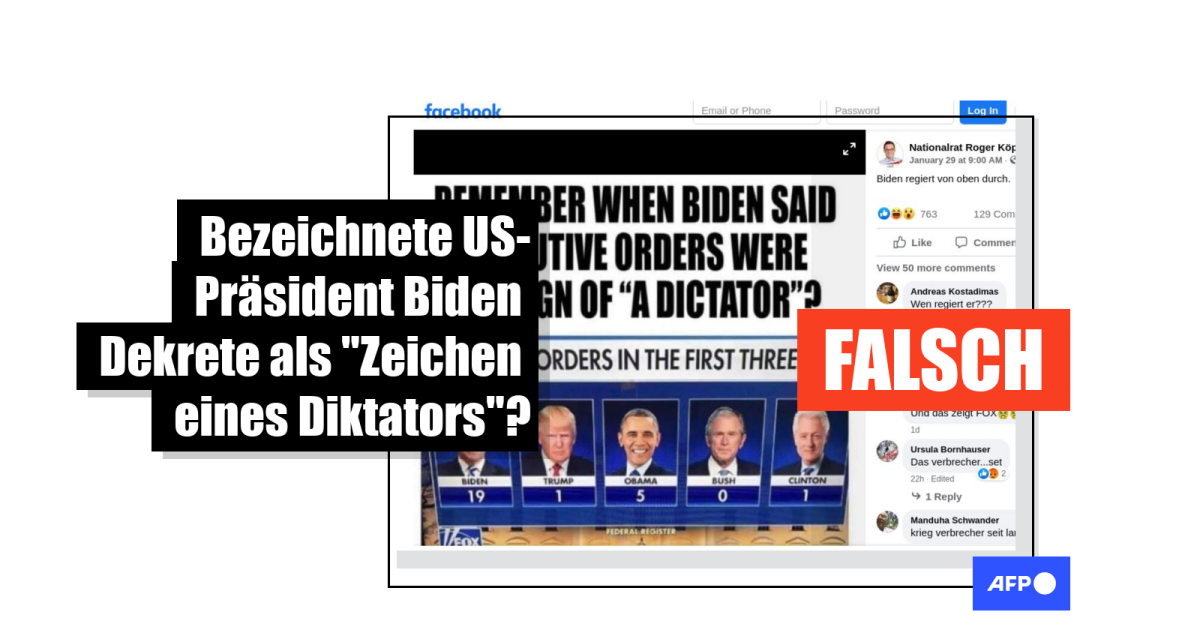 AFP hat zunächst nach den Worten “Executive Order” und “Dictator” auf Google gesucht. Sie führte zu zahlreichen Artikeln über den vermeintlichen Diktatoren-Vergleich Bidens. Kritiker hatten diesen angestellt, nachdem Biden in den ersten eineinhalb Wochen seiner Amtszeit insgesamt 35 Präsidialerlasse unterzeichnet hatte. Bei solchen “Executive Orders” handelt es sich um Rechtsverordnungen des US-Präsidenten, die keine vorherige Zustimmung aus dem Parlament benötigen.