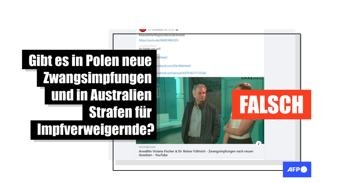 Aus dem geteilten Video geht dabei nicht hervor, von welcher Art der Zwangsimpfung Anwältin Fischer genau spricht. Weil sie sich besonders gegen Maßnahmen zur Eindämmung des Coronavirus einsetzt, hat AFP noch einmal gezielt eine Corona-Impflicht in Australien geprüft.